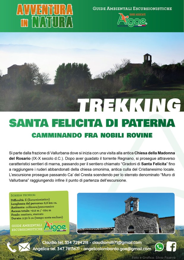 Si parte dalla frazione di Vallurbana dove si inizia con una visita alla antica Chiesa della Madonna del Rosario (IX-X secolo d.C.). Dopo aver guadato il torrente Regnano, si prosegue attraverso caratteristici sentieri di marna, passando per il sentiero chiamato “Gradoni di Santa Felicita” fino a raggiungere i ruderi abbandonati della chiesa omonima, antica culla del Cristianesimo locale. L’escursione prosegue passando Ca’ del Cresta scendendo per lo sterrato denominato “Muro di Vallurbana” raggiungendo infine il punto di partenza dell’escursione.