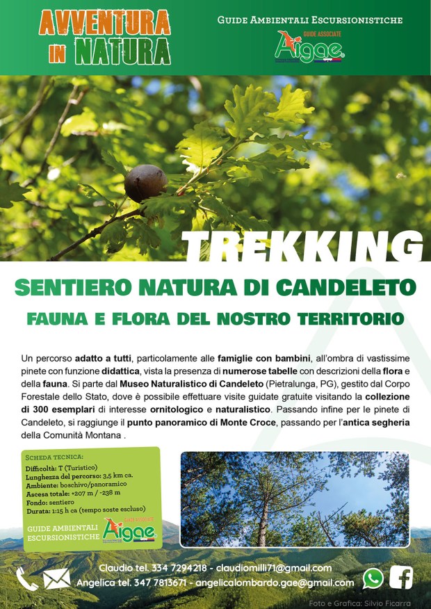 Un percorso adatto a tutti, particolamente alle famiglie con bambini, all’ombra di vastissime pinete con funzione didattica, vista la presenza di numerose tabelle con descrizioni della flora e della fauna. Si parte dal Museo Naturalistico di Candeleto (Pietralunga, PG), gestito dal Corpo Forestale dello Stato, dove è possibile effettuare visite guidate gratuite visitando la collezione di 300 esemplari di interesse ornitologico e naturalistico. Passando infine per le pinete di Candeleto, si raggiunge il punto panoramico di Monte Croce, passando per l’antica segheria della Comunità Montana .